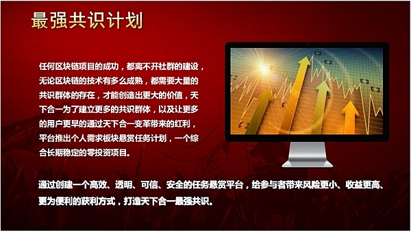用户下载天下合一APP后可以做领取任务:(做任务拿奖励,每天拿300到600元不等),也可以做发布任务获取奖励:(不同的行业可以在这个平台发布任务, 需求者完成获取对应佣金。)收益分类:(推荐人获得多板块收益合世币i,举例B获取10枚,A获得1.2枚,一级12%。二级5%;领取任务完成获取(现金)奖励,举例,他人发布一条悬赏信息,B做完领取100元,取扣除15%B获得85元,A会获得15%中的10%合1.5元,一级获得手续费10%,二级获得手续费5%)。